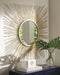 This accent mirror is a contemporary musing. Its breathtaking sunburst design shines in goldtone metal. And the mirror’s beautifully large scale makes it the center of attention.