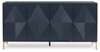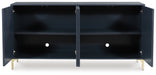 | Details | Made with solid wood, engineered wood and cast resin components, Dark blue finish, Goldtone metal legs, Door fronts with geometric pattern, 4 doors with magnetic push latch function, 2 adjustable shelves, Openings in back for electronics, Minor assembly required, simply lay flat and attach feet | |