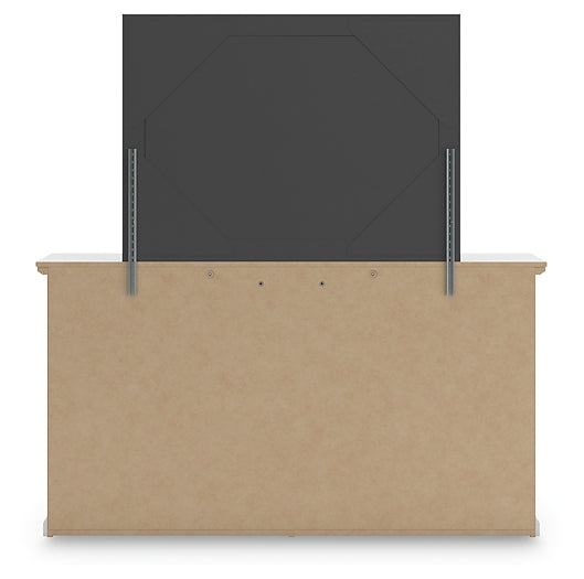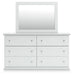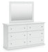 Details Includes dresser and mirror, Made of engineered wood (MDF/particleboard), Knobs with pewter-tone finish, Scalloped moulding, 6 smooth-operating drawers, Includes tipover restraint device, Mirror attaches to back of dresser; can also be mounted on wall horizontally or vertically, Safety is a top priority, clothing storage units are designed to meet the most current standard for stability, ASTM F 2057 (ASTM International), Drawers extend out to accommodate maximum access to drawer interior while maintaining safety