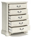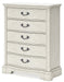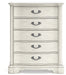 Add a touch of romance to your bedroom with this chest of drawers. Its antiqued white painted finish and serpentine-shaped silhouette details are the picture of easy elegance. Five spacious drawers offer ample storage space, while custom-designed bar pulls add originality.