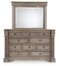 Details Includes dresser and mirror, Made with hardwood solids, oak and ash veneer, cast resin components and engineered wood substrates, Tops with inlaid ash veneer border, Light warm grayish brown glazed wood finish, Round metal knobs with satin nickel-tone finish, 10 drawers with fully finished interior, dovetail construction and ball-bearing side glides, Drawers with inset framed fronts, Dresser with breakfront pilasters, Mirror frame features light bridge with 2 mini LED lights, Mirror attaches to back of dresser