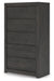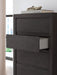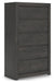 Details Made with engineered wood (MDF/particleboard/plywood) and decorative laminate for the right balance of affordability and durability, Dark charcoal finish over replicated oak grain, Decorative laminate replicates natural or man-made material surfaces with consistent color, pattern and texture, Recessed hand grabs create hardware-less effect, 5 smooth-gliding drawers, Drawer interiors are lined with a faux linen laminate for a clean, finished look, Safety is a top priority, clothing storage units are designed to meet the most current standard for stability, ASTM F 2057 (ASTM International), Drawers extend out to accommodate maximum access to drawer interior while maintaining safety, Assembly required