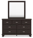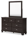Details B441B8: Includes panel headboard, footboard, rails and slats, Made with hardwood solids, engineered wood veneer and MDF substrates, Dark brown finish, Floating panel headboard, Picture frame footboard, Foundation/box spring required, sold separately , Mattress available, sold separately, Assembly required, B441B1: Includes dresser and mirror, Made with hardwood solids, engineered wood veneer and MDF substrates, Dark brown finish, Metal bar pulls with bright nickel-tone finish, 7 smooth-gliding drawers with dovetail construction and metal center guides, Drawer interiors are lined with a wood grain laminate for a clean, finished look, Top moulding on dresser, Mirror attaches to back of dresser,