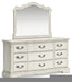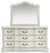 Details B980B4: Includes headboard, footboard and rails, Made with hardwood solids, spruce veneer, MDF substrates and cast resin components , Antiqued white painted finish, Polyester upholstery, Button tufting, Foundation/box spring required, sold separately, Mattress available, sold separately, Assembly required, B980B1: Includes dresser and mirror, Made with hardwood solids, spruce veneer, MDF substrates and cast resin components, Antiqued white painted finish, 9 drawers with fully finished interiors, French and English dovetail construction and ball-bearing side glides, Metal bar pulls with aged pewter-tone finish, Mirror attaches to back of dresser,