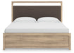 The natural wood tones and clean lines of this king upholstered panel bed echo your easygoing style sensibilities. With a warm finish and replicated oak grain, its carefree character lightens up your bedroom. Curved inner corner details soften the look, while contrasting brown fabric modernizes the feel. And for added function, warm LED lighting adds serene ambiance at the touch of a button.