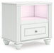 | Details | Made with engineered wood (MDF/particleboard/plywood) and decorative laminate for the right balance of affordability and durability, Matte white finish, Decorative laminate replicates natural or man-made material surfaces with consistent color, pattern and texture, Crystal drawer knob, 1 smooth-operating drawer, Drawer interior is lined with a faux linen laminate for a clean, finished look, Open shelf, USB-A and USB-C charging ports, Pink, purple and white LED lighting options; touch button control, Power cord included; UL Listed, Minor assembly required | |