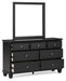 | Details | Includes dresser and mirror, Made with hardwood solids, birch veneer and MDF substrate, Black painted finish, 7 smooth-gliding drawers with dovetail construction and ball-bearing side glides, Round metal drawer knobs with satin nickel-tone finish, Framed drawer fronts, Tapered feet, Mirror attaches to back of dresser, Assembly required | |