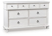 Taking a laid-back approach to casual traditional design, this artfully crafted dresser combines classic elements with a clean modern approach. Its rubbed antiqued white finish exudes a comfy, timeless appeal that's sure to carry you away to a dreamy time and place. Simple round metal knobs and ring pulls on the dresser's spacious drawers make just the right statement.