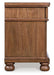 Taking a laid-back approach to casual traditional design, this artfully crafted nightstand combines classic elements with a clean modern approach. Its rich medium brown wood tone exudes a comfy, timeless appeal that's sure to carry you away to a dreamy time and place. Simple round metal knobs and ring pulls on the nightstand's spacious drawers make just the right statement, while an integrated power outlet and USB charging keep your devices powered up overnight.