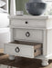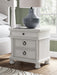 Taking a laid-back approach to casual traditional design, this artfully crafted nightstand combines classic elements with a clean modern approach. Its rubbed antiqued white finish exudes a comfy, timeless appeal that's sure to carry you away to a dreamy time and place. The simple round metal knob and ring pulls on the nightstand's spacious drawers make just the right statement, while an integrated power outlet and USB charging keep your devices powered up overnight.