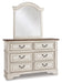 | Details | B743B12: Made of veneers, wood and engineered wood, with cast resin components, Antiqued two-tone finish, 6 smooth-gliding drawers with dovetail construction, Dark bronze-tone hardware, Mirror attaches to back of dresser, Assembly required, Includes tipover restraint device, B743B13: Made of veneers, wood and engineered wood, with cast resin components, Includes upholstered headboard, footboard and rails, Distressed, chipped white finish, Upholstered headboard with foam cushion, button tufting, Assembly required, Mattress and foundation/box spring available, sold separately, Bed is compatible with an adjustable base, | |