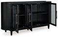 | Details | Made with hardwood solids and oak veneer, Black finish on textured wood grain surface, 3 glass cabinet doors, Interior shelving, Burnished nickel-tone pulls, Tapered legs, Assembly required | |