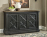 Invite your family into the heart of your home with this dining room server. Its beautifully textured black finish and timeworn planked oak top create a unique two-tone contrast. A charming lattice design graces the front of the doors. Thick pilasters add to the sturdiness of the foundation. And cabinets offer plenty of storage space for essentials. This is trend-right urban farmhouse style.