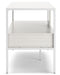 Details Made with engineered wood and melamine laminate, Replicated pickled white oak wood grain, MEGA-TUFF® melamine surfaces are made of easy-clean melamine which is heat-, scratch-, water- and stain-resistant, Tubular metal frame with white powder coated finish, Goldtone hardware, Open shelf, 2 storage drawers, Assembly required