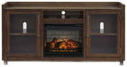 Details Includes XL TV stand and electric fireplace insert (W100-101), Made of acacia veneers, wood and engineered wood, Oiled walnut-tone finish, Dark bronze-tone metal hardware, 2 glass-front cabinets, each with an adjustable shelf; adjustable/removable center shelf, open cubby and cutouts for wire management and venting for heat, Electric fireplace insert provides up to 5,386 BTU/1,500W and warms up to 1,000 square feet (heats larger rooms), 7-level temperature setting; 5 levels of flame brightness, LED-lit multi flame display operates with or without infrared heat, Realistic-looking log set with dynamic glowing embers, Remote control with LED display, Timer function with programmable ranges from 10 minutes to 9 hours; overheating control device, Power cord included; UL Listed, Assembly required; simply remove the center shelf and back panel to make room for the fireplace insert