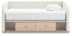 | Details | Includes upholstered back panel and side panels, under bed storage unit, rails and roll slats , Made with engineered wood (MDF/particleboard/plywood) for the right balance of affordability and durability , Smooth, light finish with replicated oak grain, Decorative laminate replicates natural or man-made material surfaces with consistent color, pattern and texture , Polyester upholstery , Knobs with black finish, 2 smooth-gliding storage drawers, Drawer interiors are lined with a faux linen laminate for a clean, finished look, Daybed uses mattress only, no box spring required , Mattress available, sold separately, Assembly required | |