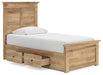 Looking to create a bedroom that feels airy and beautifully put together? This casually comfy twin panel storage bed is your perfect solution. Its clean lines, replicated oak grain and on-trend natural finish exude a charming cottage-inspired feel that brightens your restful retreat. Spacious drawers with dark bronze-tone knobs stow away clothes and more. Now there’s a fresh take on country living we can get behind.