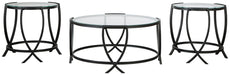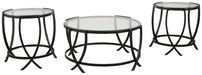 | Details | Includes coffee table and 2 end tables, Metal base in black finish, Clear tempered glass tabletop with beveled edge, Assembly required | |
