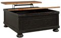| Details | Made with pine veneers, wood and engineered wood, Two-tone distressed finish (light brown top and rustic vintage black base), Split-top design (spring lift/hinge lift with stay arm), Metal bracket accents, Assembly required | |