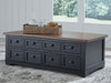 Raise the bar on modern farmhouse style with this lift-top coffee table. Its sturdy silhouette and casual good looks are accentuated with a two-tone finish, which pairs a warm satin black base with a contrasting butcher block veneer top. Combining form and function, its lift top extends for a casual dinner or extra work space in front of your sofa. Two spacious lower drawers and handy storage bins under the top make this piece awfully useful, too. Whether your style is vintage, country or eclectic, this table adds a hearty element.