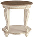 Elevating the art of traditional cottage styling, this round end table is sure to serve you beautifully for years to come. Antiqued two-tone aesthetic blends a chipped white with a distressed wood finished top for added charm. Classic cabriole legs and shapely lower shelf are a lovely twist. Decorative corbels add refinement.