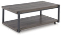 | Details | Includes coffee table and 2 end tables, Made with MDF substrate, decorative paper laminate and metal, Laminate features a replicated wood grain with a weathered gray coloration, Metal frame with gunmetal powder coat finish, Open storage shelf, Coffee table with casters for easy mobility, Assembly required | |