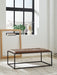 Master the art of casual chic with this coffee table ottoman. The soft, inviting top, upholstered in supple brown leather, is perfectly balanced by a clean-lined black metal base. Its expansive surface provides ample room for trays and books, making it a highly functional and oh-so-cool anchor for your seating area.