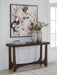 Master the art of casual contemporary design with the Korestone sofa table. Its softly rounded wood frame top pairs perfectly with an eye-catching double wishbone base and a rich brown finish for a decidedly here and now vibe. Talk about the ideal spot for decor, plants and more.