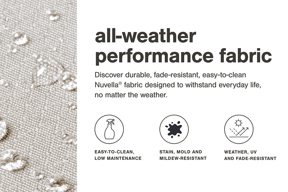 Details Includes 8 modular pieces: 6 outdoor lounge chairs and 2 outdoor end tables, Chair frame and table made with aluminum, Solution-dyed high-performance fabric, Nuvella® is an outdoor fabric that can be cleaned and offers UV resistance, Stainless steel hardware, Designed to withstand the harsh elements of the outdoors, Cushioned seat, Back cushion included, Includes PVC protective weather cover, Clean fabric with mild soap and water, let air dry; for stubborn stains, use a solution of 1 cup bleach to 1 gallon water, Assembly required