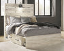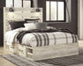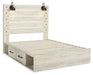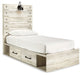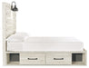 Includes headboard, footboard, two side storage, and slats, Made of engineered wood (MDF/particleboard) and decorative laminate, Wispy white finish over replicated oak grain with authentic touch, Large-scale hardware with dark finish, 2 decorative sconce lights, LED with 3 AA batteries, 4 smooth-gliding storage drawers, 4 storage cubbies, 2 slim-profile USB charging ports, Power cord included; UL-listed, Bed does not require additional foundation/box spring; accommodates most zero clearance adjustable bases with the addition of a bunkie board, Mattress available, sold separately, Assembly required |