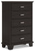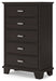 | Details | Made with hardwood solids, engineered wood veneer and MDF substrates, Dark brown finish, Metal bar pulls with bright nickel-tone finish, 5 smooth-gliding drawers with dovetail construction and metal center guides, Drawer interiors are lined with a wood grain laminate for a clean, finished look, Top moulding | |