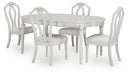 Details D795-35: Made with hardwood solids, acacia wood veneer, MDF substrate and cast resin components, Antiqued white finish, Tabletop with butterfly-matched veneer pattern, Removable center leaf, Table extends by pulling both ends and dropping in leaf, Seats up to 6, Dining chairs sold separately, Assembly required, D795-01: Made with solid wood frame and cast resin components, Antiqued white finish, Polyester upholstery, Foam cushioned seat, Includes adjustable levelers, Assembly required,