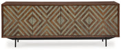 | Details | Made with mango wood and engineered wood, Warm walnut and grayish gold finish, Black metal base, 4 doors with push magnet function, 2 fixed shelves, Cutouts for wire management, Minor assembly required, simply lay flat and attach feet | |