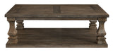Homey. Hearty. Heavenly hued. Luring with a distressed weathered gray finish and square baluster legs set on a broad lower shelf for great presence, this coffee table is sure to make your homestead feel that much more like home. The look is beautified with elm veneers and a framed and plank-effect tabletop for a richly crafted masterpiece made for years of satisfaction.