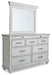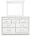 Give your retreat vintage charm and valuable drawer storage with this dresser and mirror set. In a beautifully distressed whitewash finish, you'll love putting it all away in casual style. Seven full-sized drawers and two accessory top drawers will easily accommodate your needs. Its beveled mirror brings magnificent height to this piece. Generously scaled moulding from top to bottom, along with bun feet and drawer handles with a transitional aesthetic, give this dresser and mirror character—evoking the feel of a quaint cottage escape.