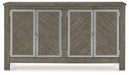 The use of mixed materials on this urban-inspired double buffet makes it a true statement piece. Made of wood with metal accents, this buffet features two spacious cabinets, each with an adjustable shelf and metal framed doors with trend-right window latches. A complex blend of stains and glaze create a weathered gray finish for a relaxed and harmonious update to your home.