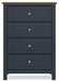Add homespun charm to your restful retreat. A modern take on a timeless silhouette, this chest of drawers pairs a dark slate blue finish with a light brown top. Drawer fronts and legs in a classic Shaker style bring an air of beautiful simplicity to the bedroom. Whether it's part of a charmingly curated guest suite or a casually carefree kids room, this chest is a welcome addition.