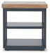 Details Includes coffee table and 2 end tables, Made with hardwood solids, mindi veneer and MDF substrate, Tabletop with light brown wood-tone finish, Base with dark blue slate finish, Coffee table includes casters for easy mobility, End tables have 2 open shelves, Assembly required