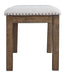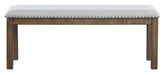This upholstered dining bench elevates the art of casual rustic style. With a distressed nutmeg finish, antiqued nailhead trim and textured polyester fabric, this upholstered dining bench entices with warmth and earthy elegance. Cushioned seat accommodates lingering meals enjoyed in comfort.