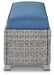 Indulge in backyard bliss. This outdoor bench has a straightforward sense of style with its light gray resin wicker and wood-look finish. Blue high-performance Nuvella+™ fabric covers the cushioned top, weathering the elements and keeping your aesthetic casually cool.