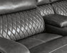 City sleek living. This loveseat is loaded with luxury. An ultra-stylish diamond stitch design pumps up the piece with eye-catching drama. And talk about style with purpose. This loveseat supports you with a high back and faux leather upholstery in gorgeous gray. Its USB charging station powers up your tech life as you recline in comfort. Cheers to the stainless steel cup holders, too.