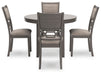 | Details | Includes dining table and 4 upholstered chairs, Table made with rubberwood solids, mindi veneer and MDF substrates, Chair made with solid wood and engineered wood, Light gray finish, Chair with light gray textured polyester upholstery, Foam cushioned seat and backrest, Chair backrest features fretwork accent, Tabletop has reverse diamond patterned veneer, Thick tapered legs, Lower shelf, Seats up to 4, Assembly required | |